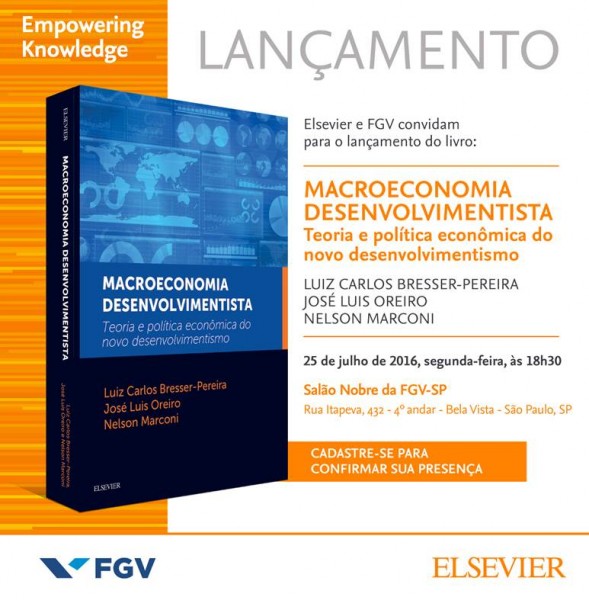 No próximo dia 25, às 18h30, estaremos lançando o livro Macroeconomia Desenvolvimentista - Teoria e Política Econômica do Novo Desenvolvimentismo, de autoria de Luiz Carlos Bresser-Pereira, Nelson Marconi e Jose Luis Oreiro, no Salão Nobre da FGV, 4º andar, com entrada pela rua Itapeva 432 ou av. Nove de Julho, 2029.