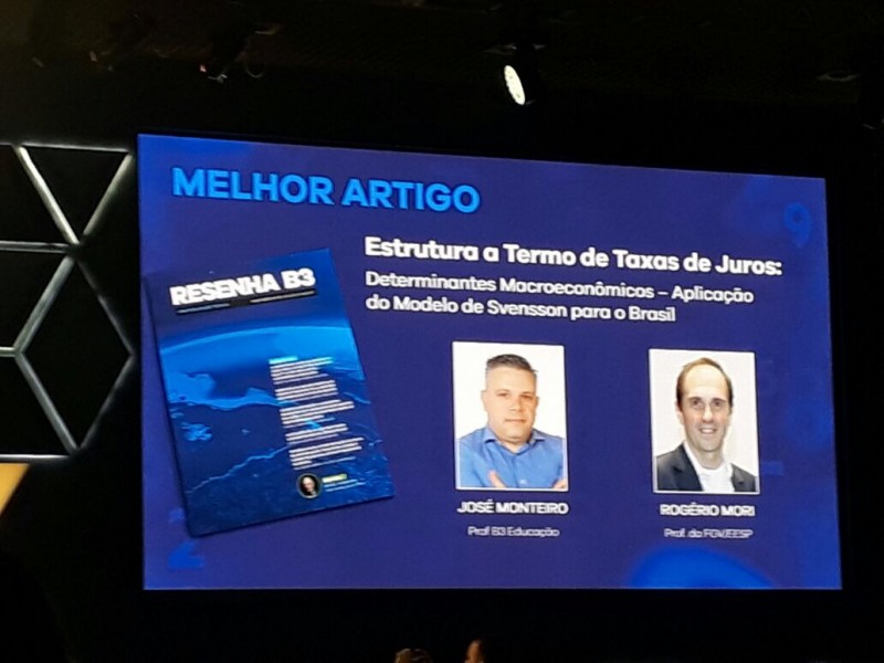 O professor e coordenador dos cursos Master da FGV EESP, Rogério Mori e o ex-aluno do curso do Mestrado Profissional em Economia, José Monteiro, ganharam o prêmio de melhor artigo com o trabalho intitulado "Estrutura a Termo de Taxas de Juros: Determinantes Macroeconômicos - Aplicação do Modelo Svensson para o Brasil", no 8º Congresso Internacional de Mercados Financeiros e de Capitais, em Campos do Jordão.